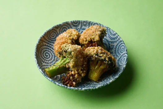 秘伝のたれに漬けてから揚げることで、香ばしさとやみつき感のある味わいに仕上げました。ブロッコリーの印象が少し変わる、楽しい一品です。