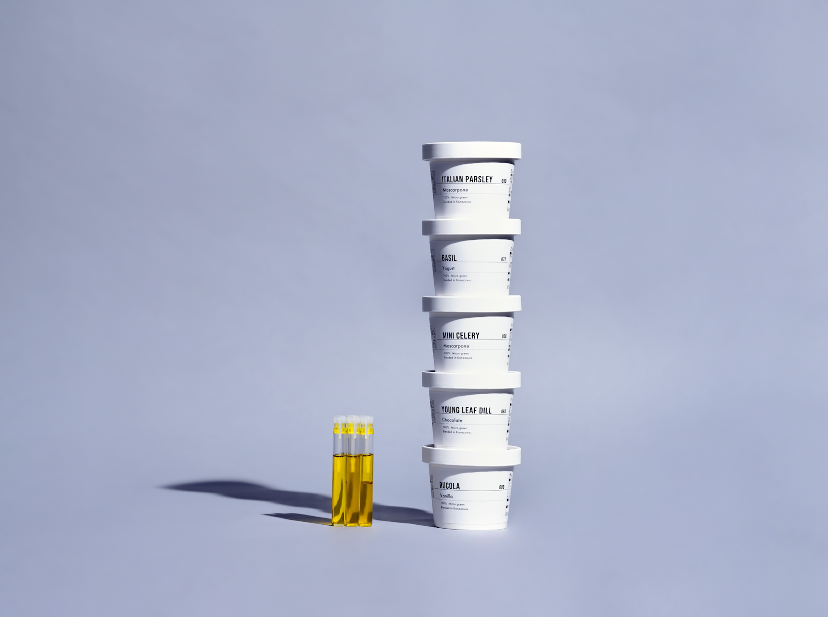 5種のベースフレーバー(バニラ、マスカルポーネ、チョコレート、ヨーグルト、ソイミルク)に、全20種のオーガニックマイクログリーンを練り込んだ100通りの高栄養価アイス。お好きな組み合わせをお楽しみください。